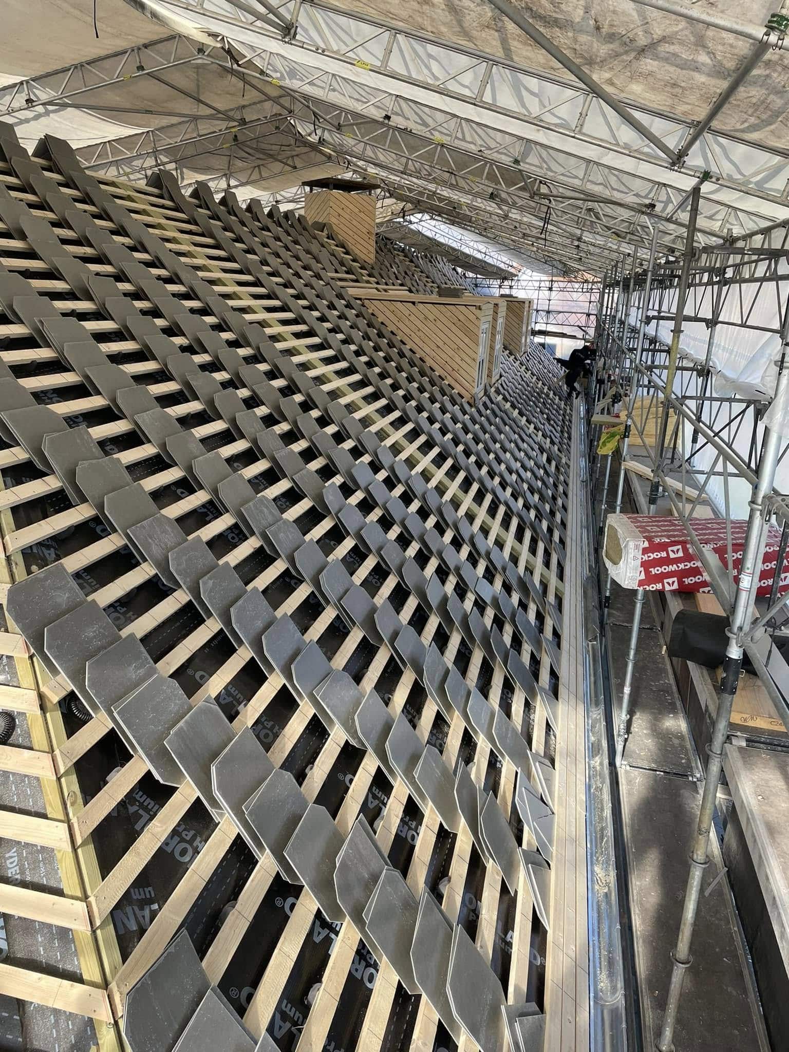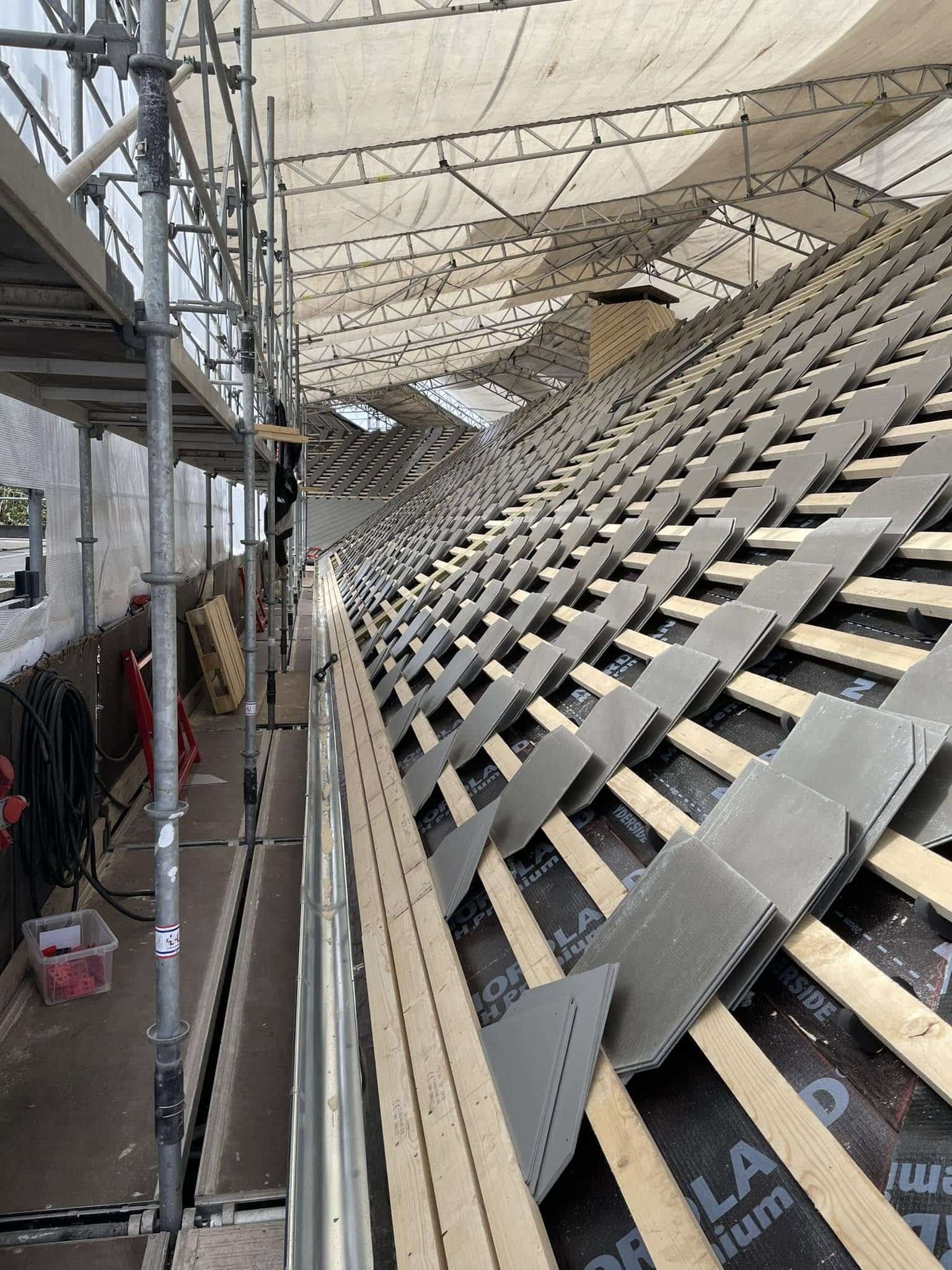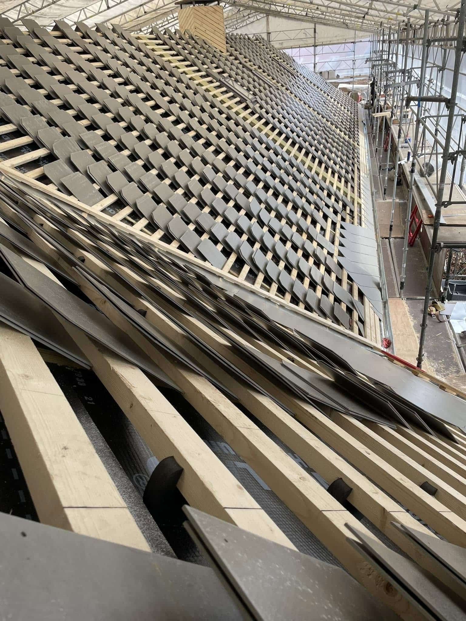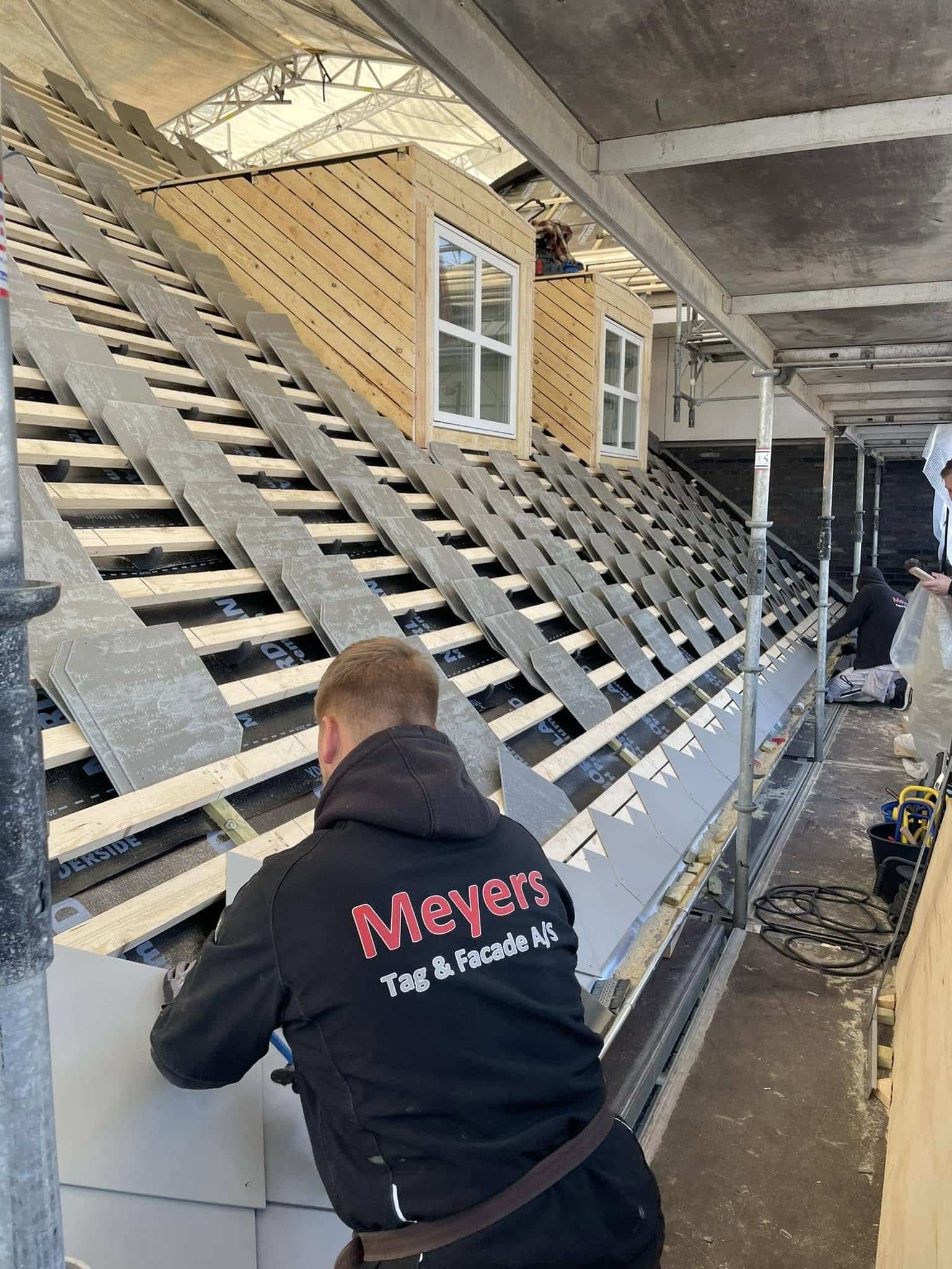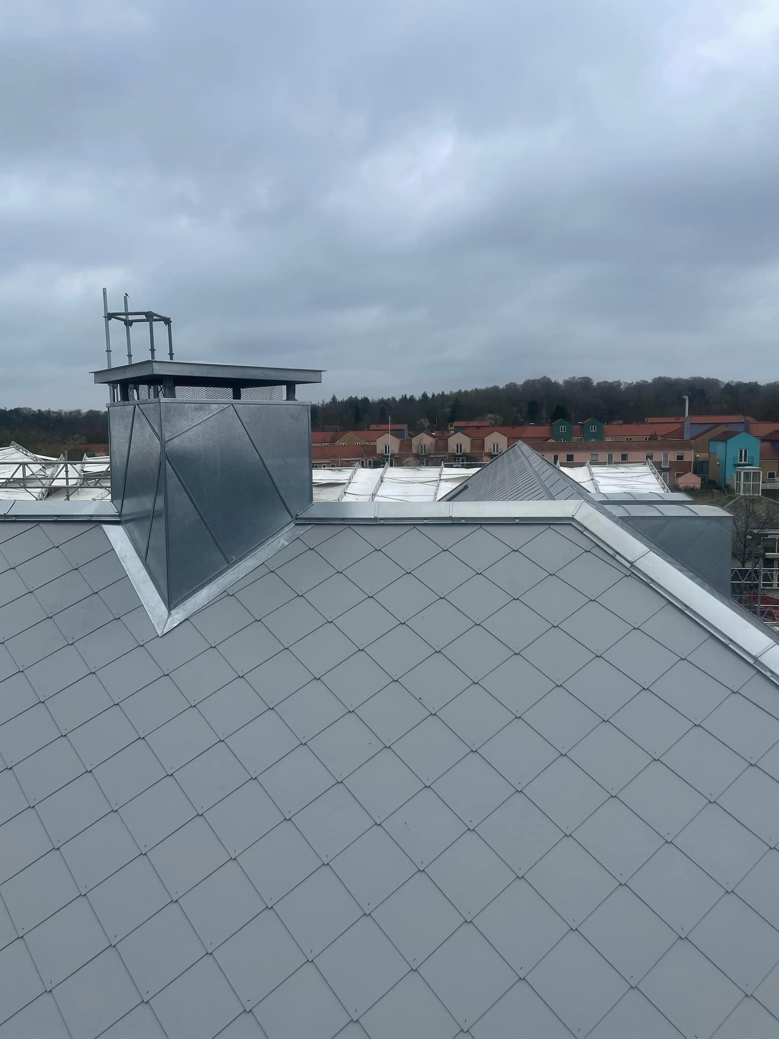 Med alle dertilhørende zinkinddækninger og kvist inddækninger.